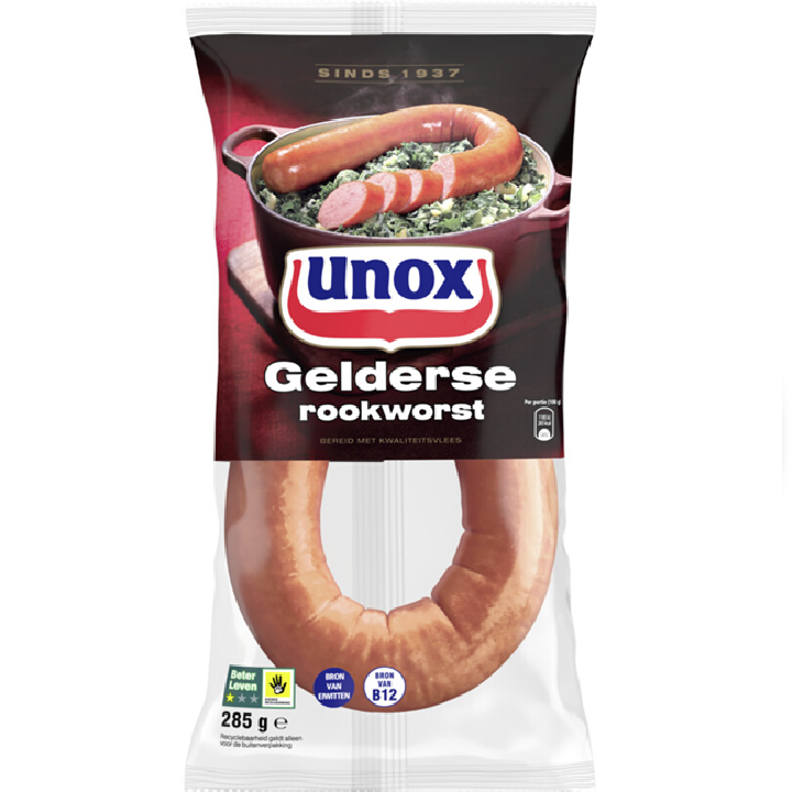 De Unox Gelderse rookworst is een onmisbaar ingrediënt in veel traditionele Nederlandse maaltijden.